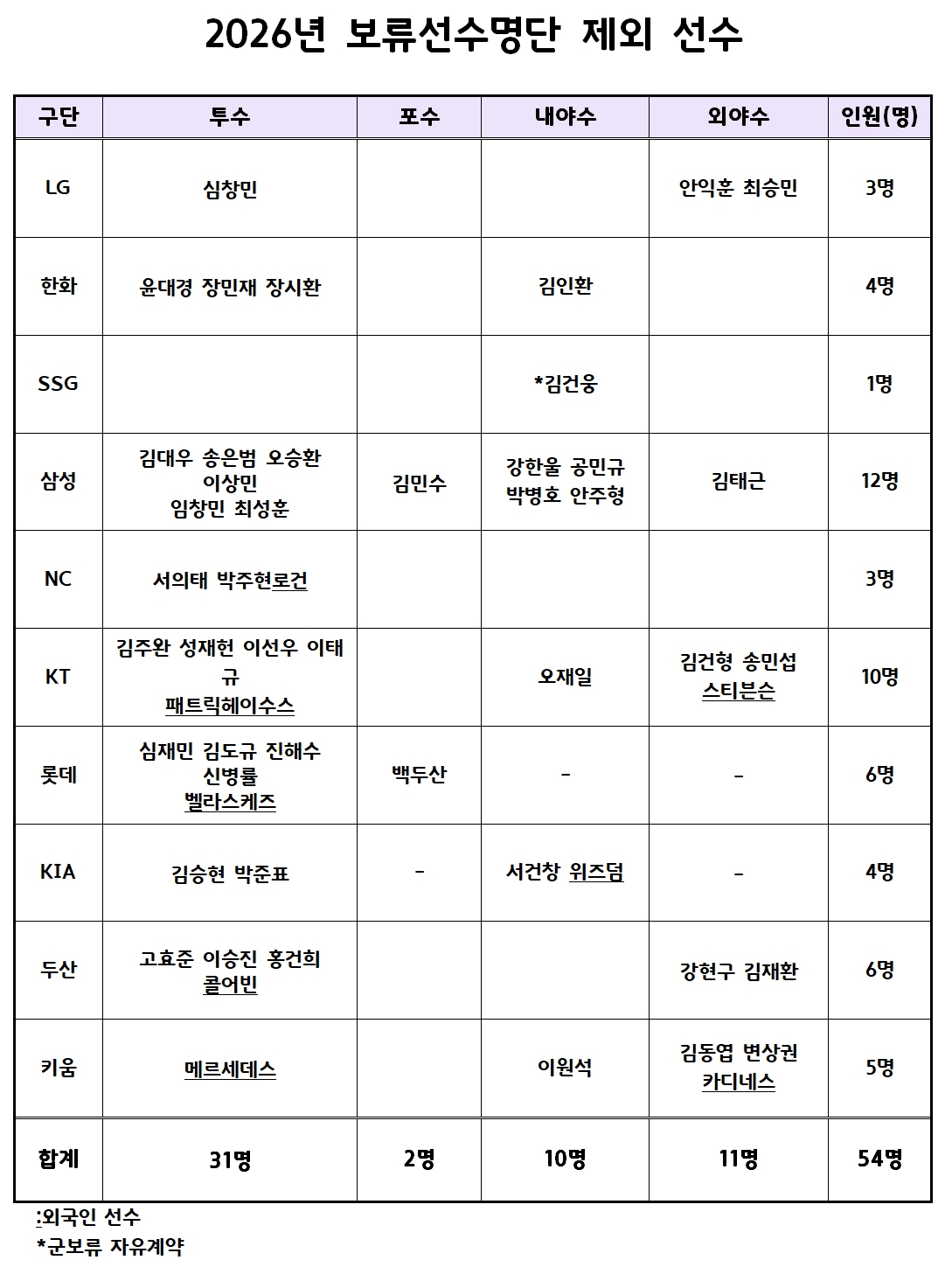 KBO는 11월 30일(일) 2026년 보류선수 명단을 공시했다.