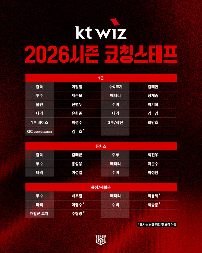 이강철 감독을 필두로 한 코치진이 1군 선수단을 이끌어 가며, 김호 코치가 1군 QC(Quality Control) 코치로 보직을 이동해 1군과 퓨처스 간 선순환 운영에 힘을 보탤 예정이다.